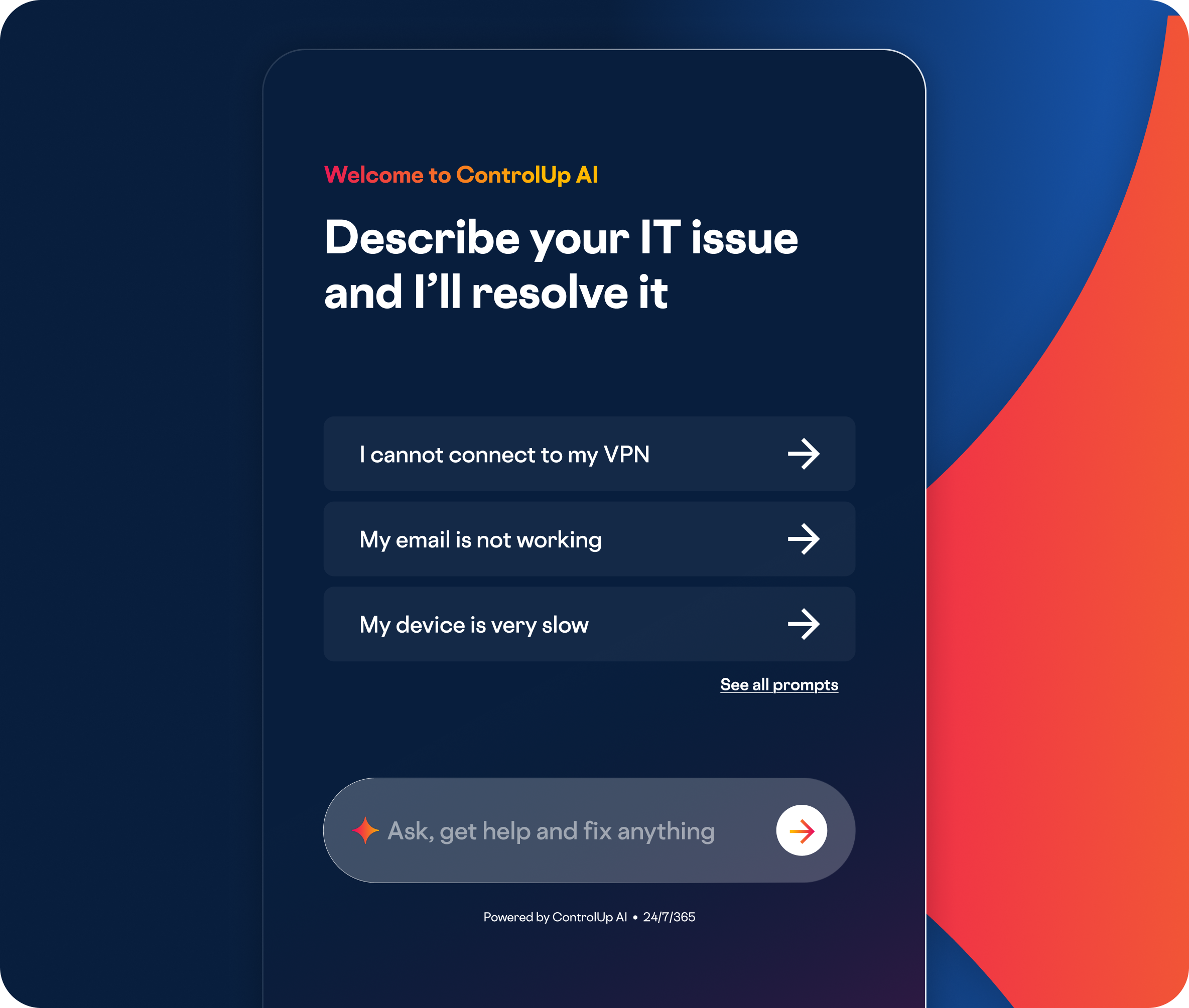 When applications freeze, performance lags, or something “just feels off,” users get instant AI-powered IT support without submitting a ticket or waiting for the help desk.