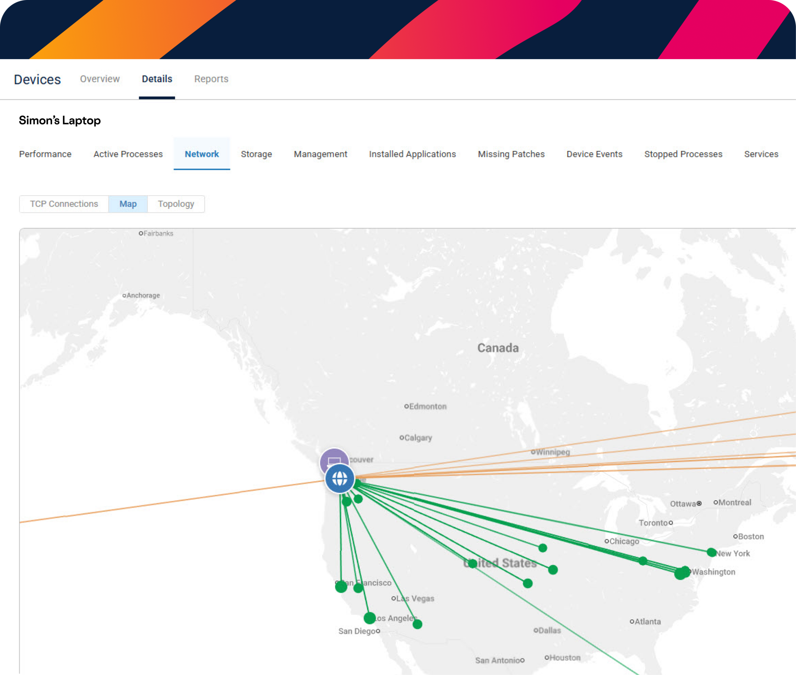 Network monitoring provides real-time insight into processes, TCP connections, network interfaces, and their geolocation on a map and topology graph