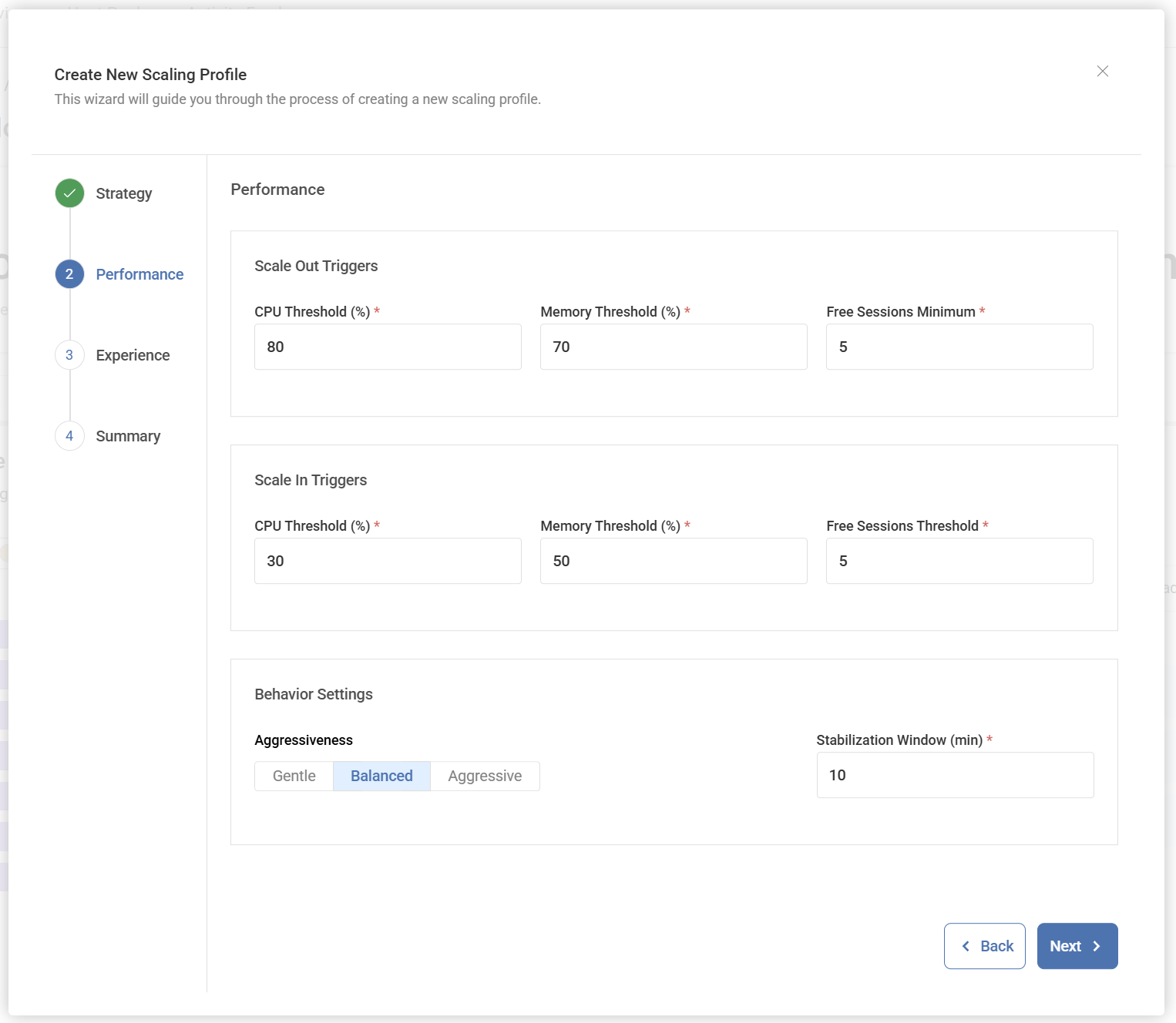 Scale Out: CPU > 80% OR Memory > 70% OR Free Sessions < 5