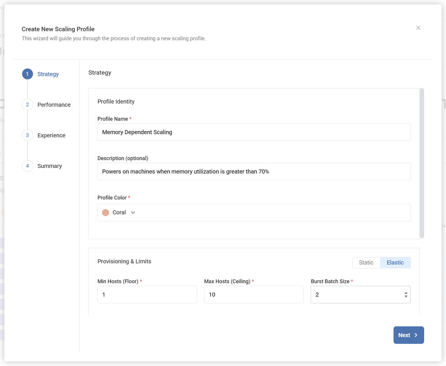 When configuring a new scaling profile, select “Elastic” and the parameters you want for the power on/off operations to take effect when executing the scaling logic. In this screenshot we are going to keep a minimum of 1 session host available with a maximum of 10 session hosts. When a scaling operation occurs it will occur with a maximum batch size of 2 session hosts. Selecting “Next” gets us to the Performance metrics we can configure for this elastic provisioning policy.